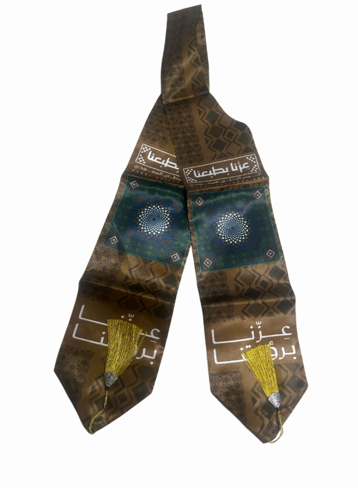 Premium Saudi National Day sash featuring the theme "Azna Berouyatna" (Our Pride in Our Vision). Made of lightweight double-layer fabric with elegant traditional patterns, finished with golden tassels for a luxurious touch. Perfect for celebrations, national events, and as a unique gift.